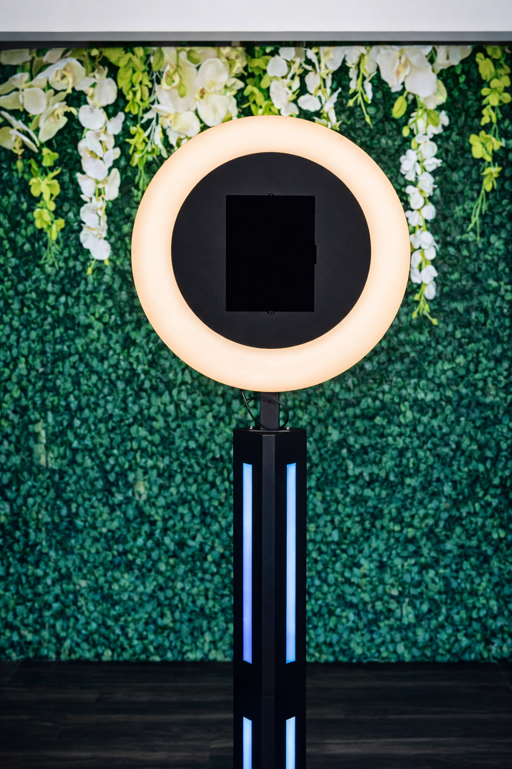 • A black photobooth with circular lighting, placed on a red carpet, in front of a shimmering, sequined backdrop at an event.